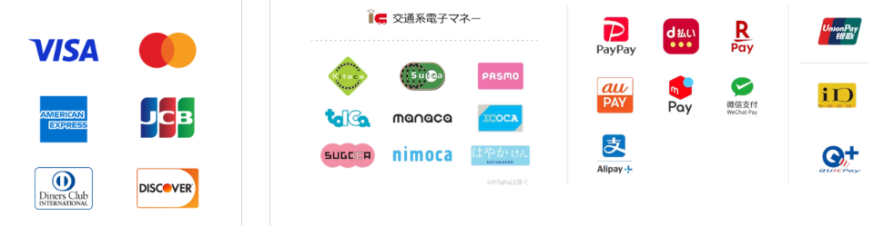 - クレジットカード:Visa、Mastercard、JCB、American Express、Diners Club、Discover、 Union Pay